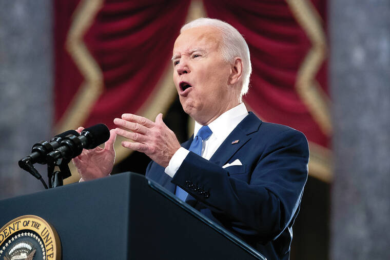 WASHINGTON — President Joe Biden forcefully blamed Donald Trump and his supporters Thursday for holding a “dagger at the throat of democracy” with election lies that sparked last year’s deadly assault on the U.S. Capitol, using the anniversary of the attack to warn that America’s system of government remains under urgent threat.