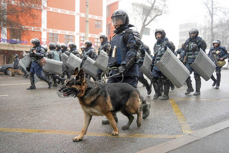 MOSCOW — Security forces in Kazakhstan killed dozens of protesters and 12 police officers died in an eruption of violence that saw demonstrators storm government buildings and set them on fire, authorities said Thursday.