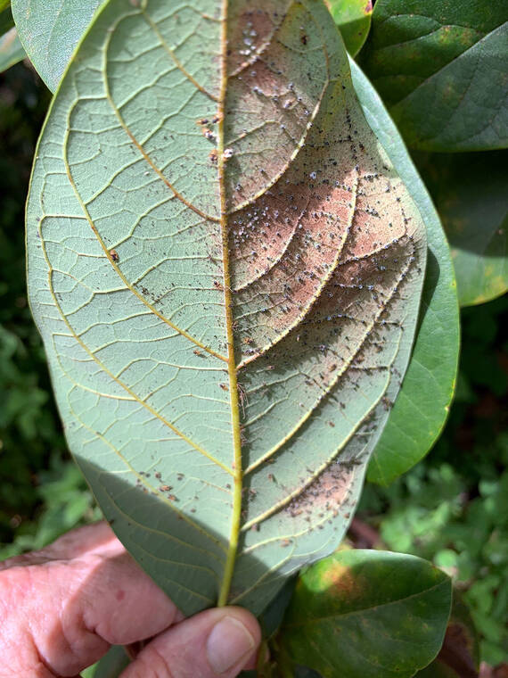 The leaves turn brown prematurely and in many cases the trees lose all their leaves. This condition is likely caused by the avocado lace bug. This insect was first noted in December 2019 on Oahu and has spread throughout Hawaii Island in 2021. Lace bug infestations will probably reduce crop yields and may even kill trees weakened by other stresses like root damage, nutritional and water issues. Natural predators of the avocado lace bug are present in Hawaii, so this infestation may be corrected. If you decide to spray your trees with a pesticide, be sure it is cleared for use on avocado trees and don’t apply while the trees are in bloom or you will kill bees and other pollinators.