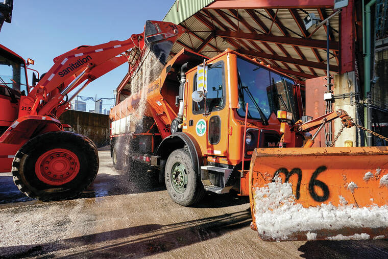 New York City Sanitation Department workers use a front-end loader to to fill a salt spreader Friday at one of the Department's salt sheds in lower Manhattan. (AP Photo/Mary Altaffer)
