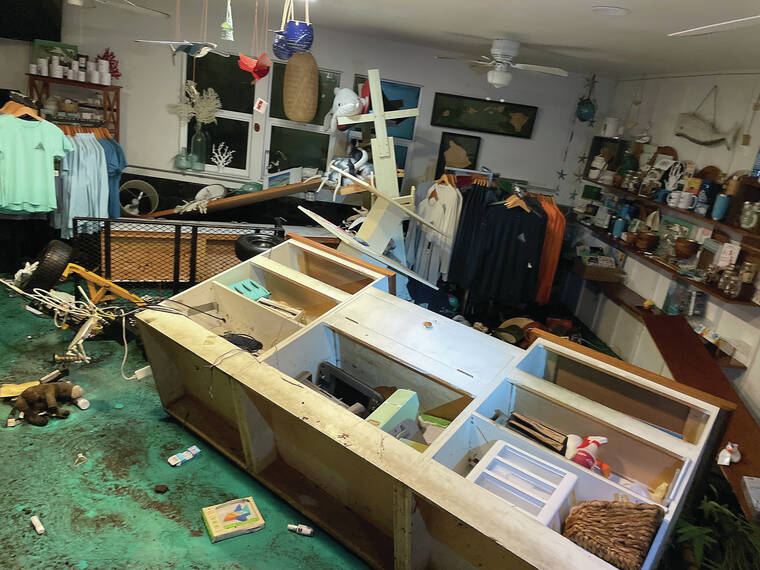 Manu and Liam Powers, owners of Sea Quest Hawaii, arrived at their store Saturday morning to find furniture and merchandise tossed around and strewn about the lanai. The force of the wave even knocked a 288-gallon propane tank over 30 feet onto the retail space and left chairs on the boat ramp.