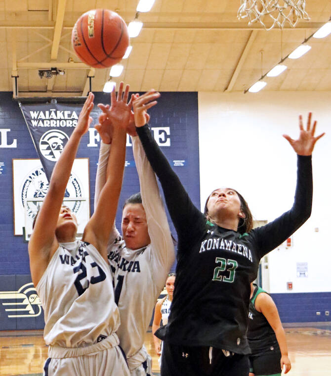 Konawaena’s Braelyn Kauhi battles Waiakea’s Korri Fernandez (23) and Avery Snyder for possession of a loose ball during Friday night’s game hosted by Waiakea. Photo: Tim Wright