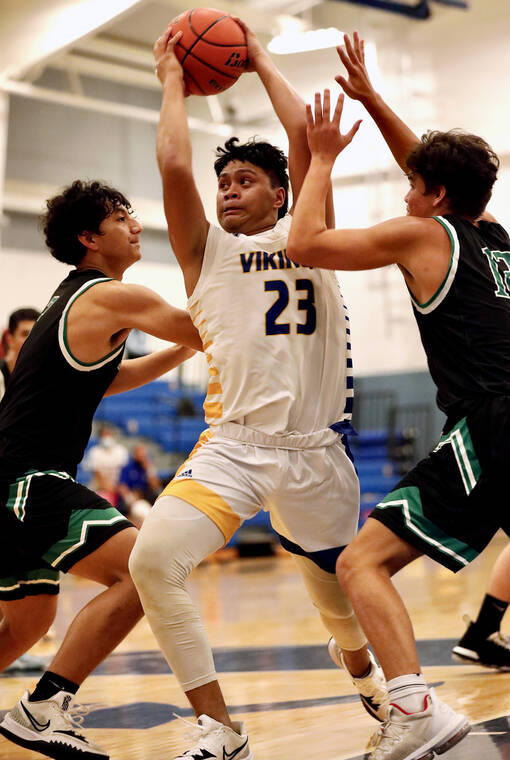 EMMA REED photo Hilo High's Peyton Pana pivots to the post between Konawaena's Tevita Lavaka and junior Jacob Holt-U'u earlier this season. The Vikings play at Ka'u on Tuesday, while the Wildcats are at Waiakea on Friday.