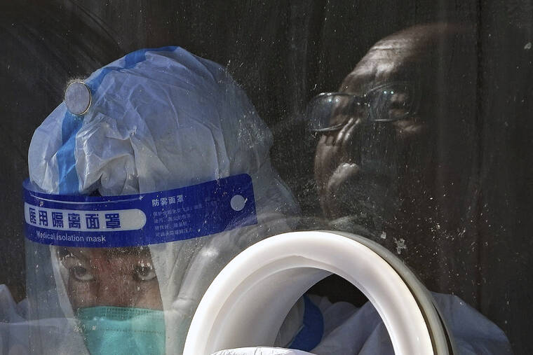 A medical worker wearing protective gear collects a sample from a resident at a coronavirus test site in Xichen District in Beijing, Tuesday, Jan. 25, 2022. Hong Kong has already suspended many overseas flights and requires arrivals be quarantined, similar to mainland China’s “zero-tolerance” approach to the virus that has placed millions under lockdowns and mandates mask wearing, rigorous case tracing and mass testing. (AP Photo/Andy Wong)