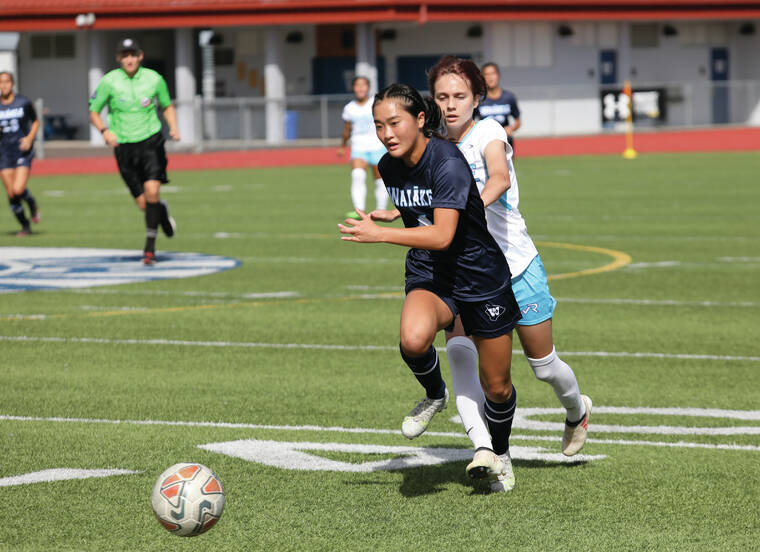 KELSEY WALLING/Tribune-Herald Waiakea midfielder KK Hashizaki races to the ball against Kealakehe's Madeline Weir during a Jan. 29 match that the Warriors won 4-1. The teams will meet again Wednesday in the semifinals after Kamehameha played the Waveriders to a draw Saturday.
