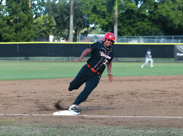 KELSEY WALLING/Tribune-Herald UH-Hilo infielder Tui Ickes rounds third and scores a run Saturday against San Diego Christian at Wong Stadium. The Vuls took four of five from the Hawks, losing the season-opening series finale 9-8.