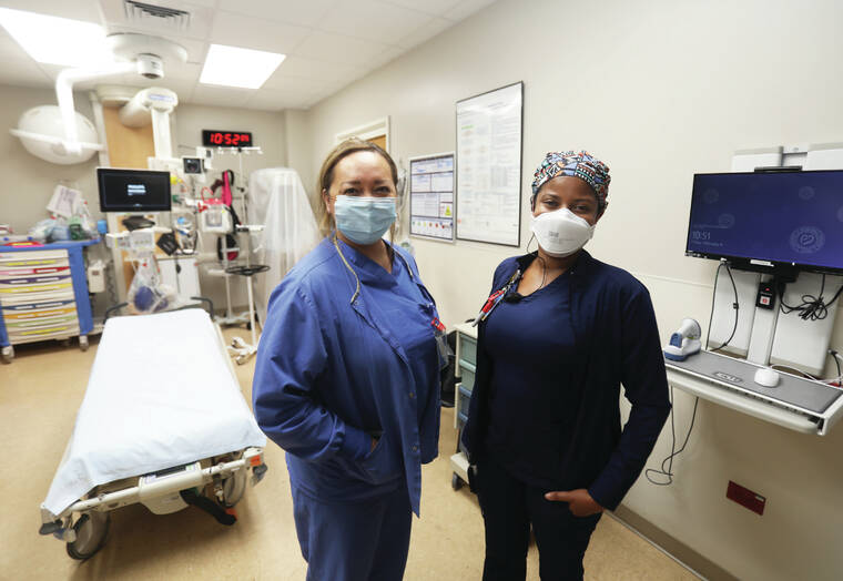 Kelsey Walling/Tribune-Herald Hilo Medical Center nurse manager Toni Higa, left, and travel nurse Sharonda Cowins stand together in the emergency department last Friday. Travel nurses have helped HMC staff deal with the surge of COVID-19 patients.