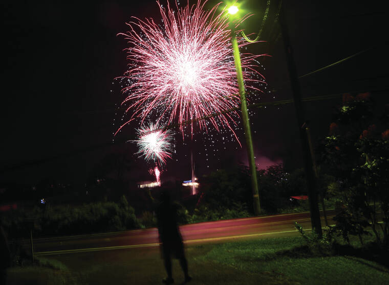 Kelsey Walling/Tribune-Herald A man watches as fireworks light the sky over Kaumana Drive in Hilo on Jan. 1.
