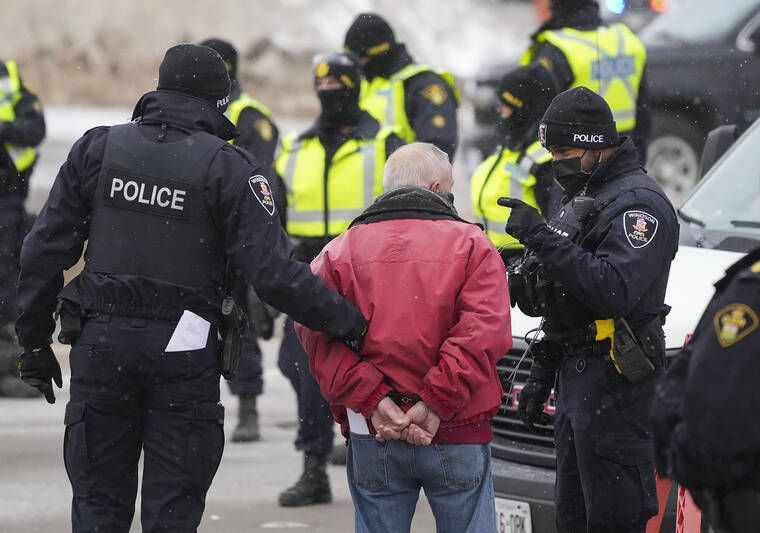 Police in Windsor, Ontario, said earlier in the day that more than two dozen people had been peacefully arrested, seven vehicles towed and five seized as officers cleared the last demonstrators from near the bridge, which links the city — and numerous Canadian automotive plants — with Detroit.