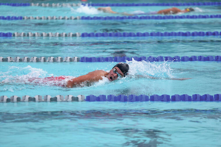 Hawaii Preparatory’s Nereo Loreto stays ahead to win the Men’s 500 Yard Freestyle during a BIIF swim meet at Kamehameha in Keaau on Saturday, Feb. 19, 2022.