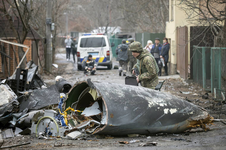 Elsewhere in Kyiv, the body of a dead soldier lay near an underpass. Fragments of a downed aircraft smoked amid the brick homes of a residential area. Black plastic was draped over body parts found beside them. People climbed out of bomb shelters, basements and subways to face another day of upheaval.
