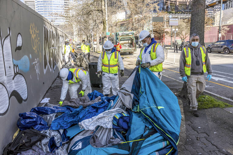 In Seattle, new Mayor Bruce Harrell ran on a platform that called for action on encampments, focusing on highly visible tent cities in his first few months in office. Across from City Hall, two blocks worth of tents and belongings were removed Wednesday. The clearing marked the end of a two and a half week standoff between the mayor and activists who occupied the camp, working in shifts to keep homeless people from being moved.
