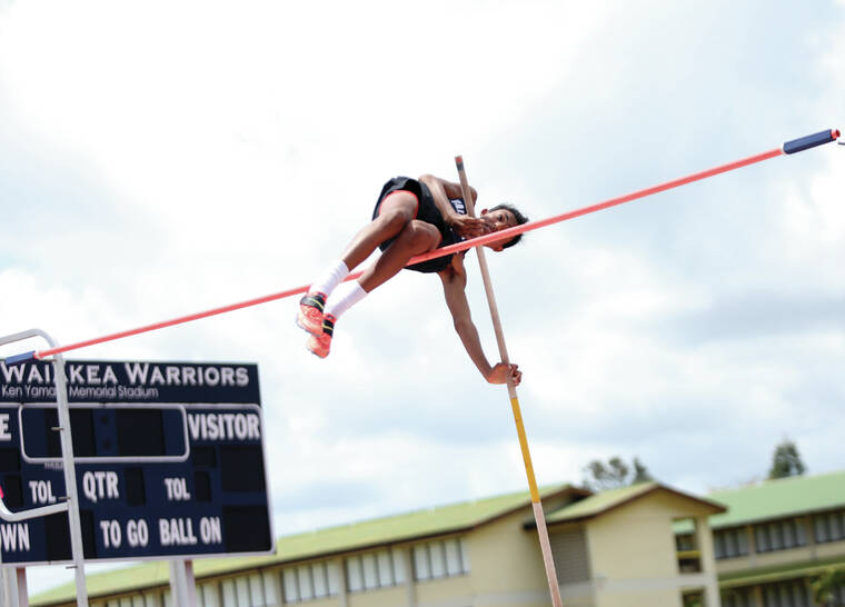 Kelsey Walling/Tribune-Herald Waiakea's Shelbey Cabais-Fernandez cleared 10 feet, 6 inches, Saturday to win the pole vault Saturday in the first BIIF track and field meet of the season.
