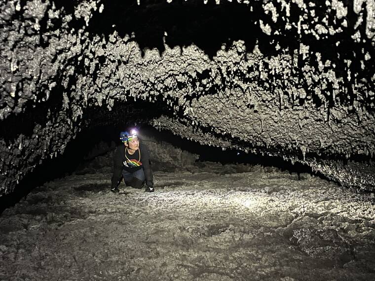 Assistant Professor Rebecca Chong explores lava tube caves on Hawai‘i Island. (Photo credit: Megan Porter)