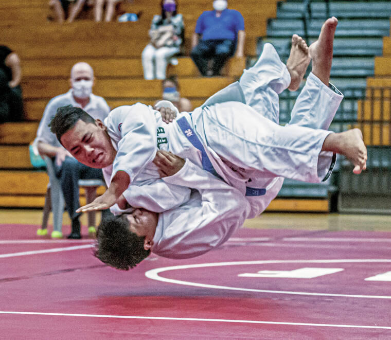Kamehameha’s Kamaha’o Halemanu takes down his opponent Saturday morning at Kealakehe. Halemanu went on to win the boys’ novice 178-lb division. (Tom Linder/West Hawaii Today.)