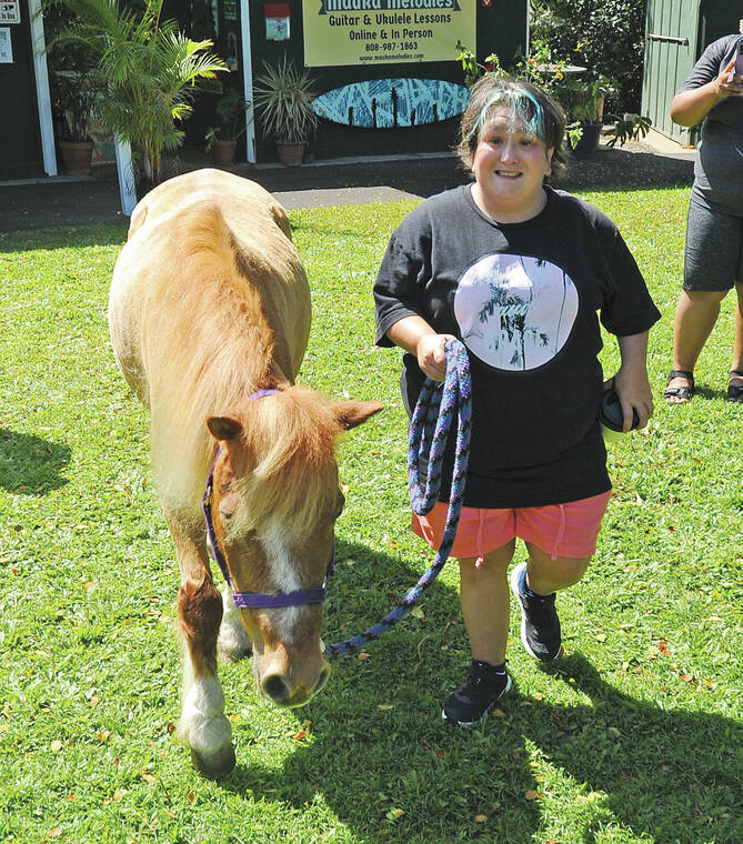 “See that smile? She’s so happy,” said Sharon, as her daughter interacted with the therapy horses during a special event for Full Life Hawaii participants at Alii Gardens Marketplace in Kailua-Kona. “We moved here from California and we’re really happy to see they had programs here. (My daughter is) motivated by people and interactions.”