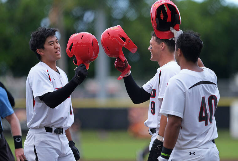 Trailing 3-1 in the nightcap, UHH tied it in the fourth without the benefit of a hit, getting a hit by pitch, an error, Bradyn Yoshida’s sac fly and a wild pitch. In the fifth,Campbell hit a double to score Casey Yamauchi, who led the inning with a walk. Campbell camme home to score on an error.