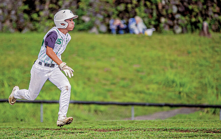 Konawaena’s Tate Garana sprints down the first-base line as he drives in one of Konawaena’s five runs in the first inning Tuesday against Pahoa. (Tom Linder/West Hawaii Today)