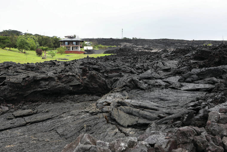 Kelsey Walling/Tribune-Herald A Leilani Estates property is seen next to extensive lava damage from the 2018 eruption on Monday, July 27, 2020. About five properties were spared when lava from Kilauea destroyed the Puna neighborhood.