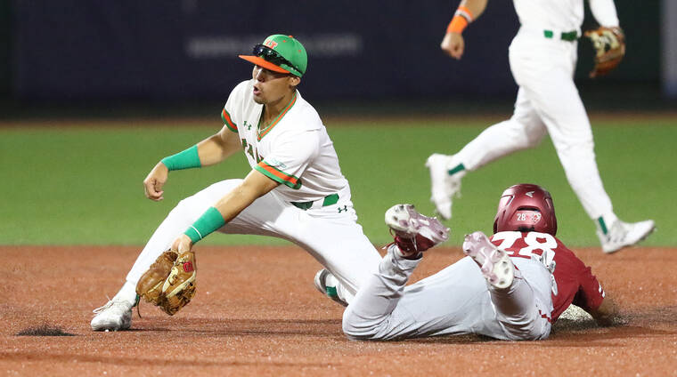 UH-Manoa photo file photo Hawaii second basemen Stone Miyao collected his first three-hit game of the season Monday as the Rainbows beat USC 9-7.