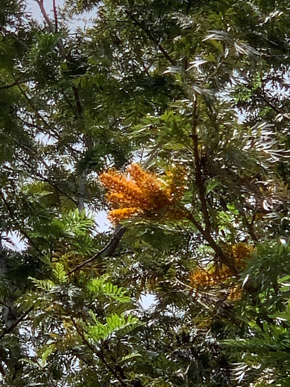 Even though there are many species yet to be discovered, it is fortunate that some of the more valuable plants have been introduced to Hawaii before their demise. Some introductions have found Hawaii so inviting that we consider them weeds. A better definition for them could be pioneer species that are attempting to heal the wounds that Man and Nature have created. The octopus tree (Schefflera actinophylla) and the silver oak (Grevillea robusta) are two examples. They tend to readily grow where the land is disturbed. If we were to be careful in protecting our native landscapes, trees like these would not be a problem. Be it as it may, let’s take a moment and forget their robust tendencies and appreciate them for their beauty. The silver oaks with their bizarre orange inflorescence may be seen in full flower along the Mamalahoa Highway in West Hawaii. Try to appreciate them from an artist’s perspective and recognize that they are like other trees, sequestering carbon and producing oxygen.