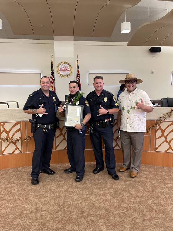 For his relentless determination in the apprehension of two suspects involved in an array of crimes involving firearms, drugs and a stolen vehicle, Hawaii Police Department Officer Jonathan Rapoza was honored with the Haweo Award during a ceremony March 22 at the County Council chambers in Kona.