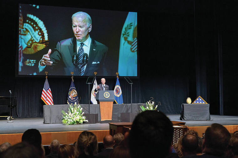 President Joe Biden speaks at the memorial service for former Vice President Walter Mondale Sunday at the University of Minnesota in Minneapolis. (AP Photo/Jacquelyn Martin)