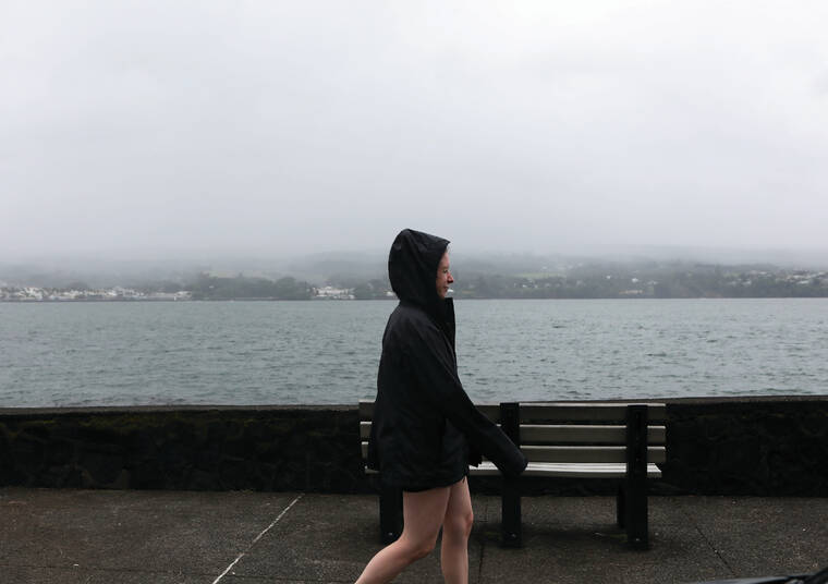 Kelsey Walling/Tribune-Herald A woman walks in Liliuokalani Park and Gardens on Tuesday as rain falls over Hilo Bay.