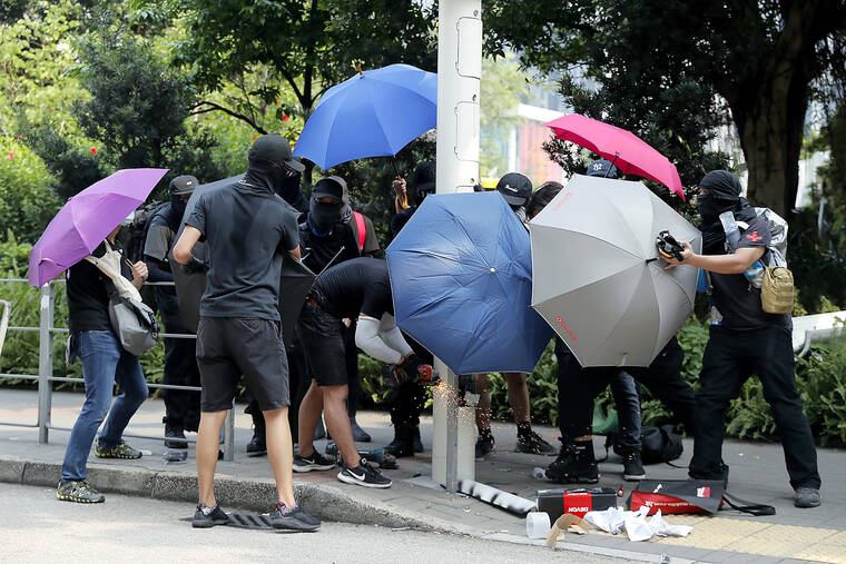 THE FACTS: Despite suggestions that the video is current, it shows protesters, some holding umbrellas, downing a “smart lamppost” in August 2019, before the COVID-19 pandemic. “Hong Kong: people are cutting down facial recognition towers,” a widely shared tweet of the video reads. Another tweet sharing the video claims: “Hong Kong is rebelling against the COVID police state by cutting down and destroying security cameras.” Footage of the same events can be seen in 2019 social media posts and in a still image captured by The Associated Press on Aug. 24, 2019. As the AP reported that day, protesters took to the streets to demand the removal of the lampposts over worries that they could contain high-tech cameras and facial recognition software used for surveillance by Chinese authorities. The same video was misrepresented in 2020 posts that claimed protesters were tearing down a 5G pole and falsely implied that 5G was responsible for the coronavirus. It was filmed near a large shopping mall in Hong Kong called MegaBox. In Hong Kong, the rising costs of China’s strict “zero COVID” strategy have sparked a backlash, the AP has reported. Hong Kong reopened beaches and pools and relaxed other pandemic restrictions on Thursday.
