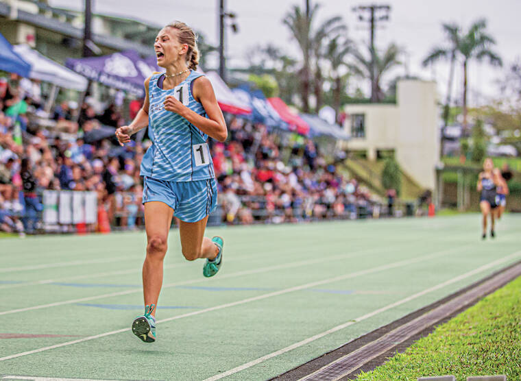 Kealakehe’s Cozette Wood lets out a yell as she approaches the finish line in front of the crowd at Konawaena Saturday. Wood won BIIF titles in both the 1500 and the 3000-meter races. (Tom Linder/West Hawaii Today)