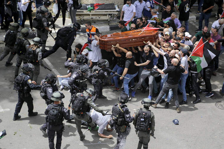 JERUSALEM — Israeli riot police on Friday pushed and beat pallbearers at the funeral for slain Al Jazeera journalist Shireen Abu Akleh, causing them to briefly drop the casket in a shocking start to a procession that turned into perhaps the largest display of Palestinian nationalism in Jerusalem in a generation.
