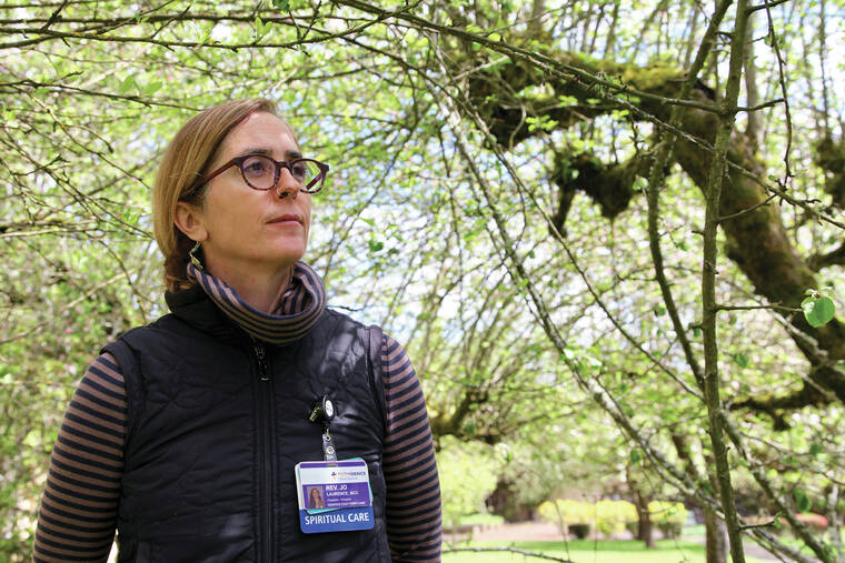 There to guide her along the journey was the Rev. Jo Laurence, a hospice and palliative care chaplain. But rather than invoking God or a Christian prayer, she talked of meditation, chanting and other Eastern spiritual traditions: “The body can weigh us down sometimes,” she counseled. “Where is the divine or the sacred in your decline?”