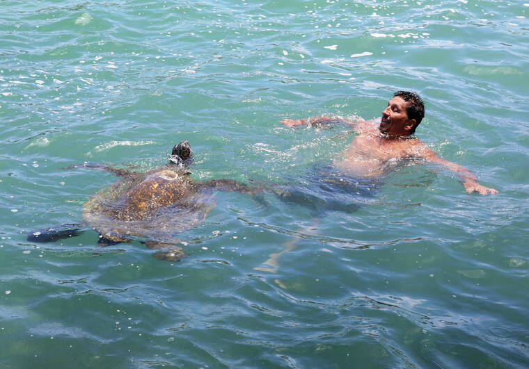 Kelsey Walling/Tribune-Herald A sea turtle follows Raymond Macias as he tries to swim away at Carlsmith Beach Park in Keaukaha.