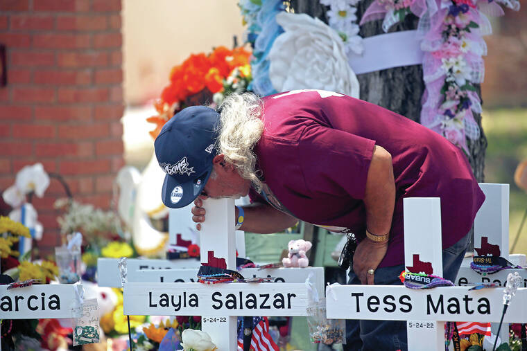 Many are wearing maroon, the color for Uvalde’s school district. And light blue ribbons adorn the giant oaks that shade the city’s central square, where mourners come to lay flowers around a fountain and write messages on wooden crosses that bear the victims’ names. In front of a day care center on one of the city’s main streets, 21 wooden chairs sit empty.