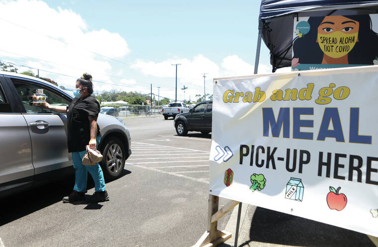 Kelsey Walling/Tribune-Herald file photo Ashlyn Flores gives two free lunches to students in a car as part of the Summer 2021 Seamless Meal Program at Hilo High School last year. Hawaii County schools will be continuing to offer free lunch to students on weekdays throughout this summer.