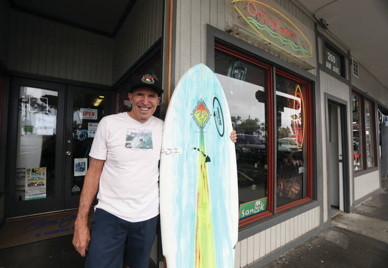 Kelsey Walling/Tribune-Herald Stan Lawrence, owner of Orchid Land Surf Shop, stands outside the shop Tuesday with a surfboard he made. Lawrence has been in business in Hilo for 50 years.