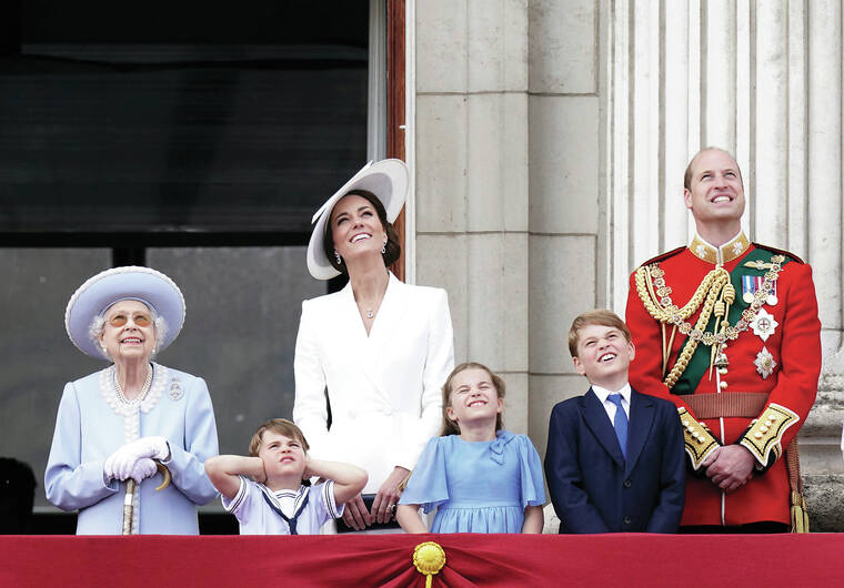 She basked in her moment. Smiling, she chatted with her great-grandson Prince Louis, 4, who occasionally covered his ears as 70 military aircraft old and new swooped low over the palace to salute the queen. The six-minute display included a formation of Typhoon fighter jets flying in the shape of the number 70.