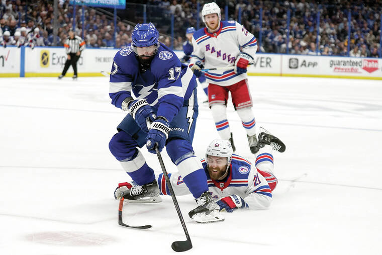 Nikita Kucherov and Ondrej Palat assisted on the winner with 6 1/2 minutes left, with the puck deflecting off Stamkos’ knee into the net after Rangers goalie Igor Shesterkin stopped the initial shot.