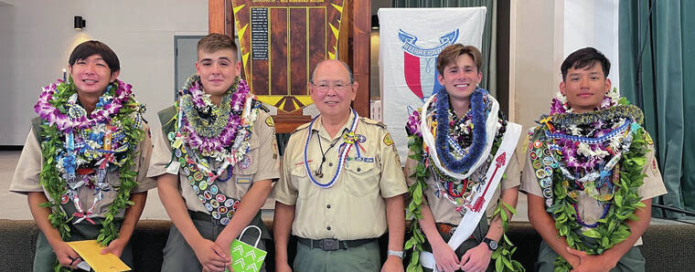 Hunter Chun Fat, 20, Adam Wall, 19, Bito Gervais, 19, and Jonathan Okamura, 18, of Scouts BSA Troop 1023B were presented Scouts BSA’s highest rank of Eagle Scout at a COVID-19-delayed Court of Honor held on June 5 at Honpa Hongwanji Hilo Betsuin’s Sangha Hall, sponsor of Scouts BSA Troop 1023B.