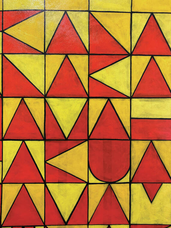 Says Pao, “The work itself is the actual words of Kamehameha’s famous and enduring the Law of the Splintered Paddle. The geometric shapes are both the positive and negative spaces of the abstracted Hawaiian words/letters of his proclamation. The choice of red and yellow signify the colors of the ali‘i and their mana and kuleana.”