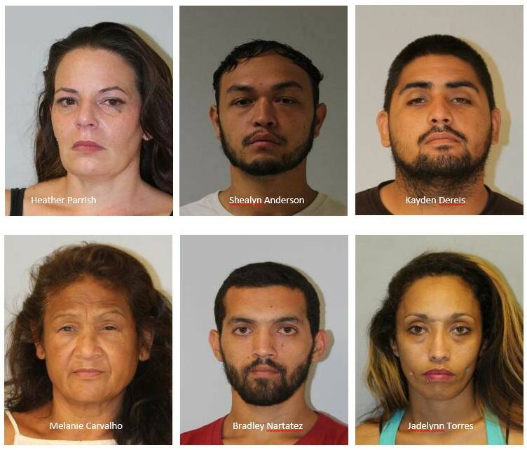 The adults arrested were: Heather Parrish, 42; Shealyn Anderson, 24; Kayden Dereis, 28; Melanie Carvalho, 59; Bradley Nartatez, 28; and Jadelynn Torres, 34.