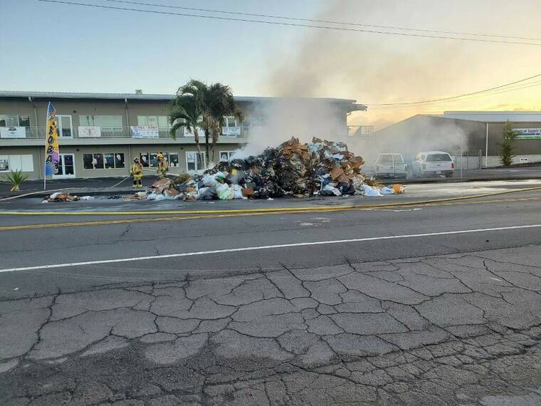 At 5:47 a.m. today, the contents in the trash compartment of a commercial rubbish truck caught on fire. The vehicle driver expelled the contents of the truck load on the shoulder of Kawili Street.