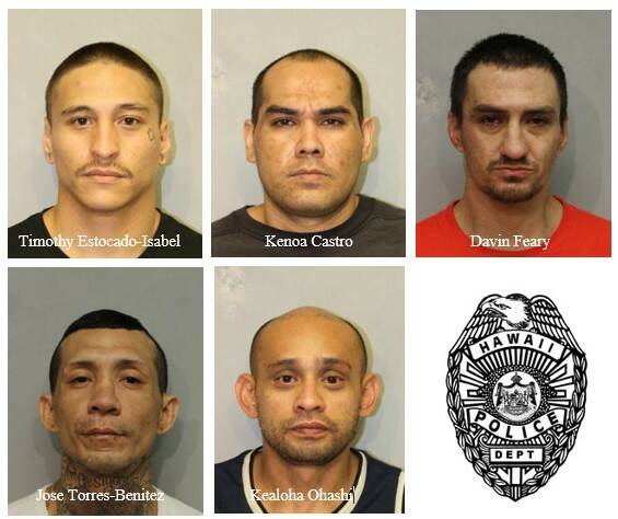The five men arrested are: Timothy Estocado-Isabel, 25; Kenoa Castro, 36; Davin Feary, 38; Jose Torres-Benitez, 34; and Kealoha Ohashi, 39.