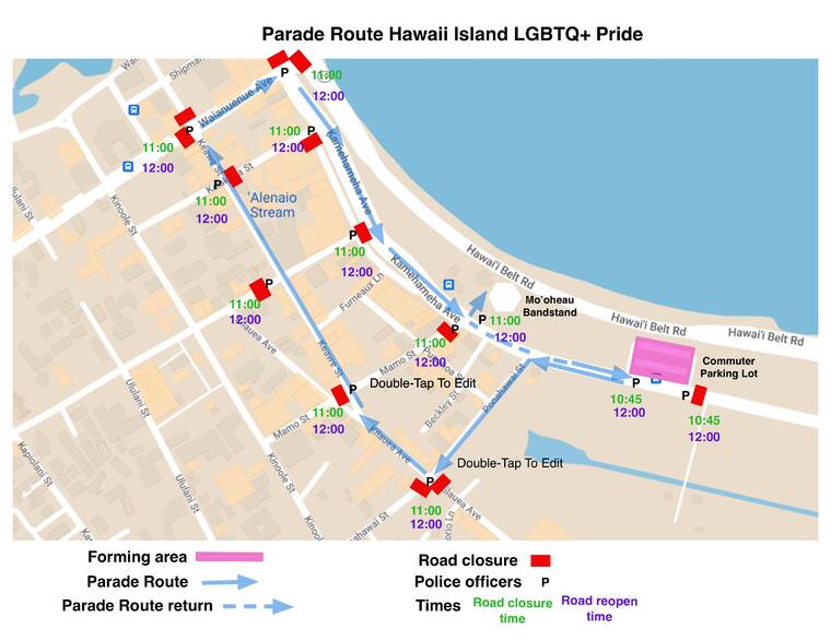 The Hawaii Police Department said road closures in downtown Hilo for the annual LGBTQ+ Pride Parade route will occur just prior to the parade’s start at 11 a.m. Saturday and will remain in place for the duration of the parade.