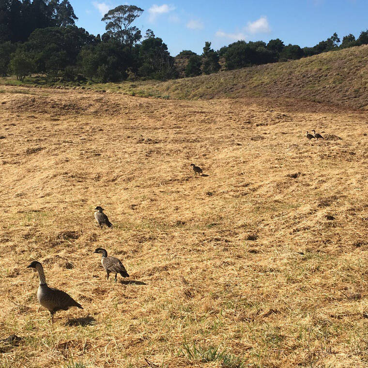 “We enhance the actual habitat in a roughly 3-acre area near the Pua Akala barn by mowing the grass, providing shelters, and controlling invasive plants like gorse,” she said.