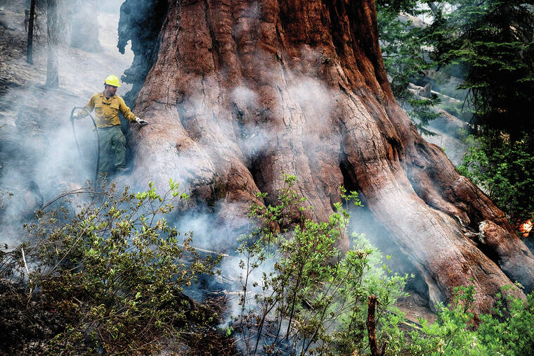 YOSEMITE NATIONAL PARK, Calif. (AP) — A wildfire threatening the largest grove of giant sequoias in Yosemite National Park more than doubled in size in a day, and firefighters were working in difficult terrain Sunday to protect the iconic trees and a small mountain town as the U.S. weathers another very active year for fires.
