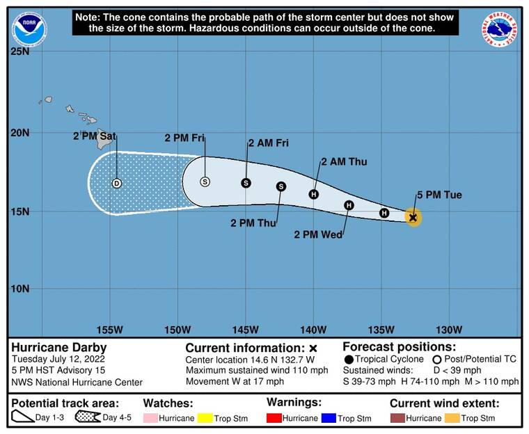 “Darby is on a weakening trend as it continues to move westward,” Leigh Anne Eaton, a forecaster for the National Weather Service in Honolulu said. “It’s expected to cross into our Central Pacific basin at the 140 West (longitude) line sometime Wednesday night or Thursday morning. … But it is expected to continue this weakening trend as it continues to move west.