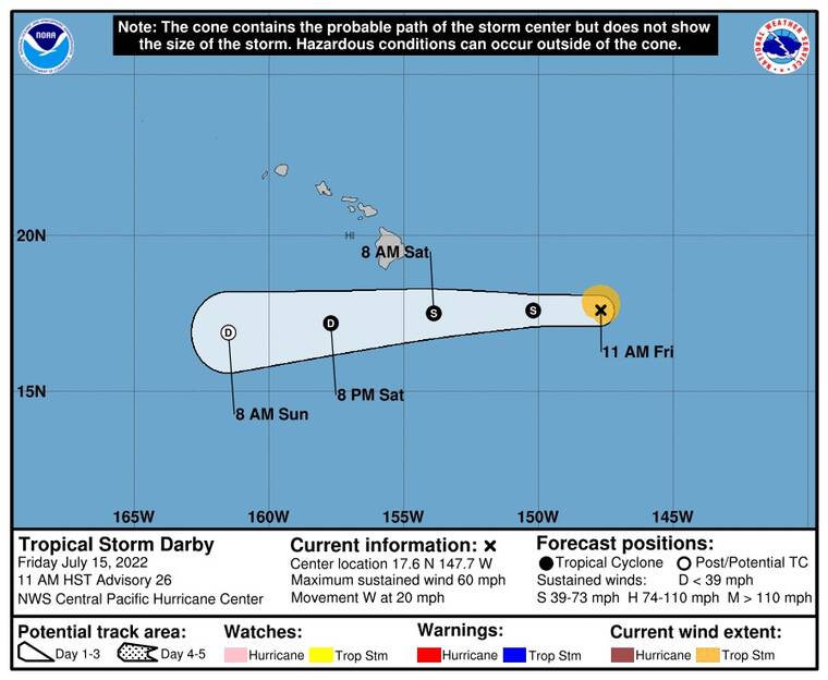 Darby is expected to weaken to a remnant low on Saturday before dissipating on Sunday. The center of the storm is expected to pass south of the Big Island at some point Saturday.