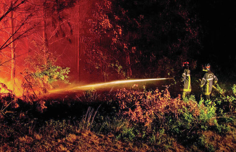 PARIS (AP) — Firefighters battled wildfires raging out of control in Spain and France, including one whose flames reached two popular Atlantic beaches on Sunday, as Europe wilted under an unusually extreme heat wave.