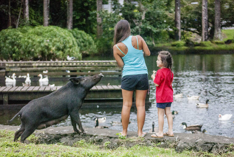 HOLLYN JOHNSON/Tribune-Herald A feral sow begs for food in 2018 at Wailoa State Recreation Area in Hilo.